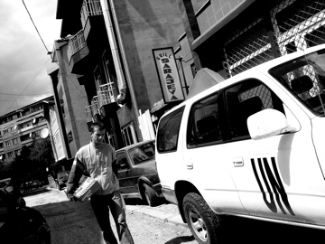 Local and International. a local kosovar-albanian selling cigarettes like this one will be lucky if he makes 100 euros a month. the average monthly salary of a kosovar is 200 euros a month. a united nations employee makes several thousand a month, not to mention legal immunity and access to a toyota 4-Runner with free gas.