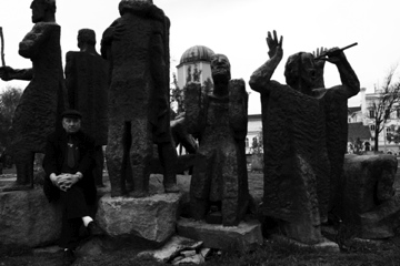 Man With Statues. he was sitting among the statues, enjoying the warm day behind the market that sells old communist gear and world war ii memorabilia.